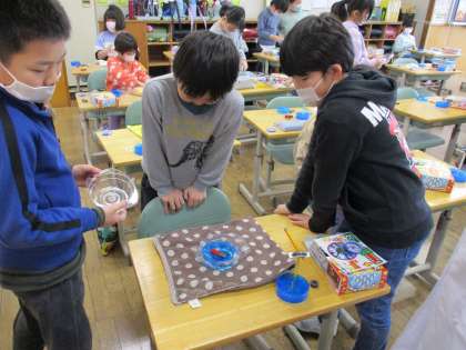 今日の理科の学習は、磁石は方位磁針になるのかどうかを確かめました。まず初めは、U字型の磁石、次にひもにぶら下げて、最後は水に浮かべて、N極が北の方角に動くかどうかを調べました。分からないときは、友達に聞いたり、率先して教えてくれたり・・・とっても温かく楽しい理科の学習が、子供たちは大好きです。来週も引き続き、実験をするそうです。楽しみですね。
