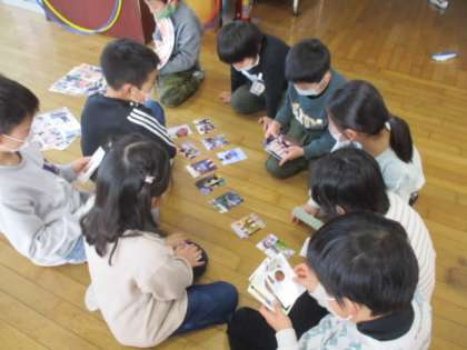家から持ってきた写真を並べて見せ合い、お互いに小さい頃の話をして盛り上がっています。