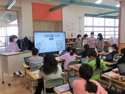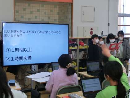 4年生に実施したアンケート結果を基に、考えたことや思ったことなどを、グループごとに報告し合いました。結果を見て、「メディア時間を減らしたらいい」や「休み時間に寒さに負けず体を動かそう」など各グループから生活をより良くするための提案がありました。それぞれのグループの提案を実行に移して、意識しながら生活していきたいですね!