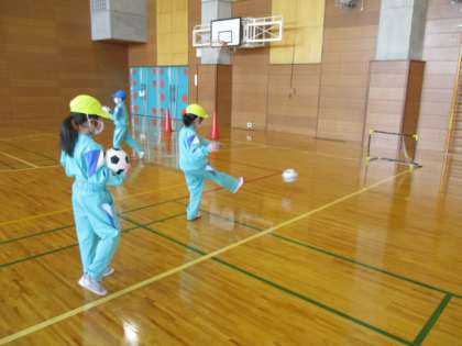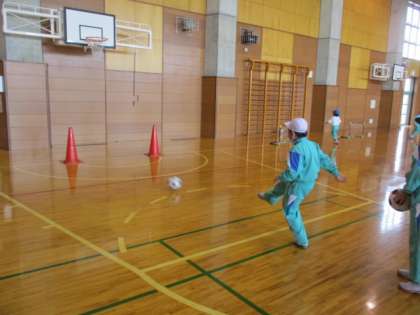 ボールを蹴って相手にパスをする練習をしています。相手のことを考えて力の入れ具合や蹴る向きを調整するなどしています。
