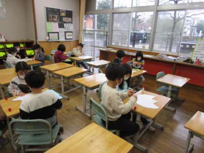 先週から卒業を祝う飾り作りを始め、教室前廊下等を楽しく飾ることができました。次は、新しい1年生を迎えるために、追加で飾りを作りました。画用紙を細かくちぎり貼りし、「にゅうがく おめでとう」の文字を作りました。友達と協力しながら丁寧に作ってました。
