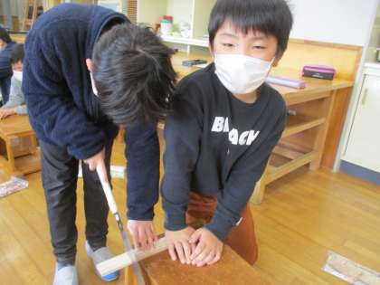図画工作科の時間では、オリジナルメッセージボードの制作に取り組んでいます。初めて使用するノコギリにドキドキの子供達でしたが、木材に当てる角度や動かし方のポイントをよく聞いて落ち着いて切ることができていました。断面がきれいに仕上がっているのを確認するととても嬉しそうにしていました。新しいことに挑戦するのは楽しいですね!