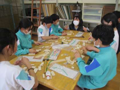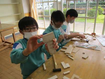 図画工作科の時間は、前回ノコギリで切り終えた木材を並べてどんな作品ができそうかイメージを膨らませ、釘で接合し組み立てています。思っていたよりもいろいろな形にすることができることに気付いたようで、楽しんで制作を続けています。