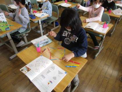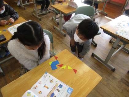 算数セットの色板や数え棒を使って、教科書に載っている形や自分で考えた形をつくりました。教科書の形にはすぐには分からないものもあるようでしたが、どのように組み合わせたらよいかよく考えて作っていました。