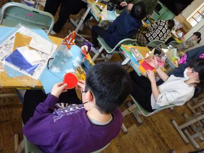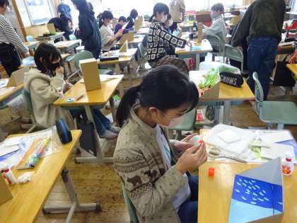 図画工作科では、5年生最後の作品を製作中です。鏡に映る様子を楽しみながら、自分が行きたい場所をテーマに作品づくりを行っています。どんな作品を仕上げようか、わくわくしながら作る様子が見られました。完成が楽しみですね!