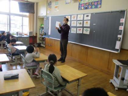 ALTのジェームズ先生に、外国語について学びました。英語でじゃんけんをしたり、動物の絵を見て英単語で話したりしました。その後、動物の絵を使ってビンゴを行いました。3年生から始まる外国語活動に向けて、意欲を高めることができました。