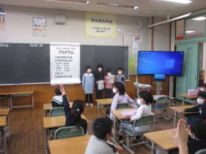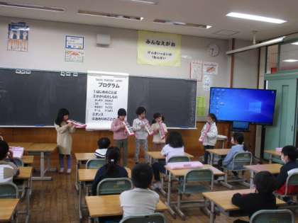 1年生として学校で過ごすのもあと2日になりました。今日は、みんなで楽しい集会を開きました。それぞれの係が出し物を用意し、発表しました。おわりの言葉の中の言葉「今日の集会は楽しかったですか」の問いかけに、元気な声で「楽しかったです!!」の返事を返していました。また1つ1年間の楽しい思い出ができたようです。