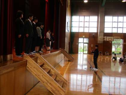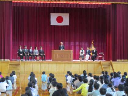 着任式では、新しく来られた教職員を児童代表の歓迎の言葉と「勇気・元気・力」を歌い、温かく迎えました。