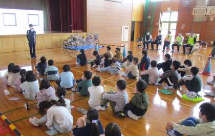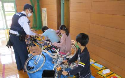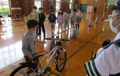 体育館では、実際に自転車に乗って交通ルールを学びました。自転車への乗り方や、信号や踏切の渡り方等、いろいろなことを実践を通して学ぶことができました。