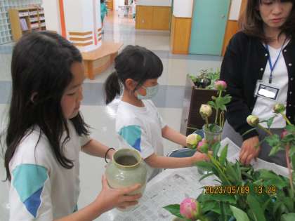各クラスの花瓶に、花を生けました。職員玄関でもシャクヤクの花がお出迎えしてくれます。