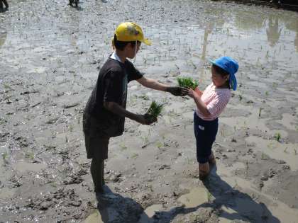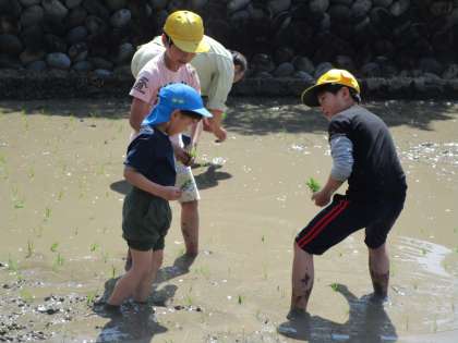 途中から、リンデ幼稚園の子供たちも一緒に田植えをしました。5年生は、お兄さん、お姉さんとして優しく苗の植え方を教えてあげていました。