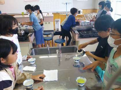 家庭科の学習では、事前に調べた美味しいお茶のつくり方を基に、急須を使って自分たちでお茶を淹れました。