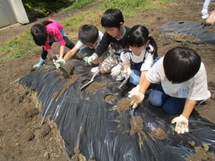さつまいもの苗植えを行いました。土をそっとかぶせたり、友達の作業を手伝ってあげる優しい姿を見ることができました。あさがおもさつまいもも、一年生で力を合わせてお世話を頑張っていきましょう!