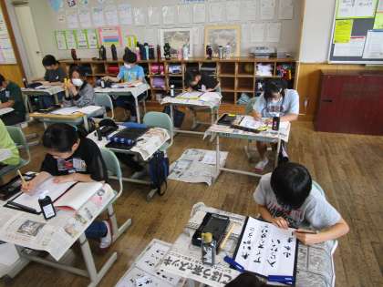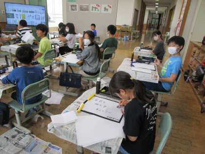 自分が考えた俳句を書写の時間に墨で書きました。俳句のイメージが伝わるように字の大きさやバランス等を考えて、書くことができました。