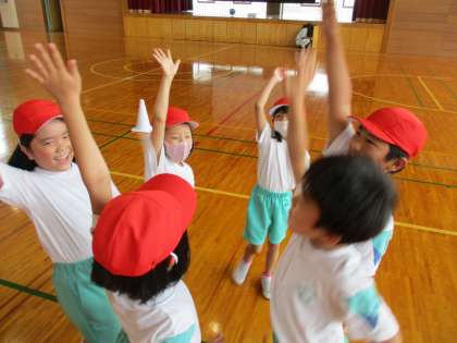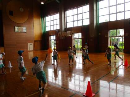 体育科では、ドッジボールに夢中になって取り組んでいます。キャッチボールや「ハンターとうさぎゲーム」などの練習と試合を積み重ねてきたことで、ボールが苦手で逃げ回っていた子供がしっかりとキャッチする姿が見られるようになりました。また、勝利に向かってかけ声で士気を高めるなど、清々しい気持ちで競技に取り組んでいるところもすてきでした。