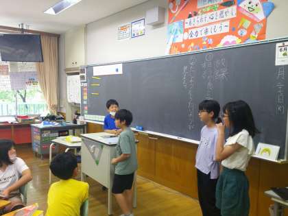 国語科の学習で同じ読み方の漢字クイズ大会を行いました。国語辞典を使って同じ読み方で漢字の違う言葉を調べ、文章を考え、クイズにしました。まずは、グループで行い、その後グループの中で一番よかったクイズを全体に出題しました。