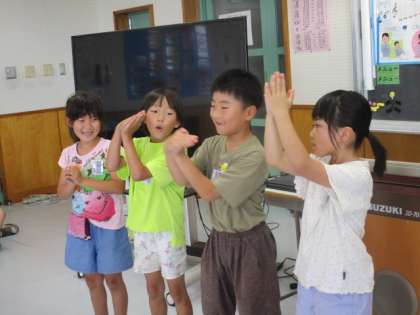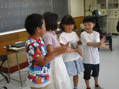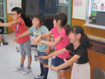 音楽の時間に「うみ」の歌に合わせてグループごとに体の動きを考えました。魚が泳いでいる様子や波の様子を体で表現しました。歌に合わせて楽しそうに体を動かしていた子供たちでした。