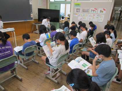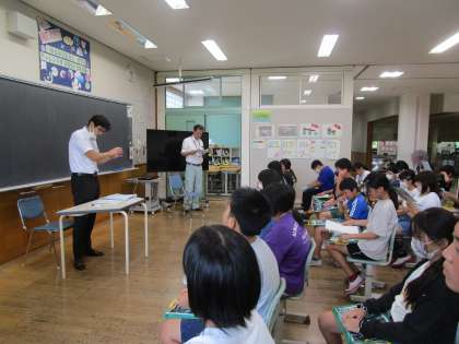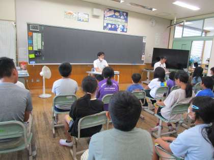 今日の総合的な学習の時間は、富山市役所農業振興課より2名の方をゲストティチャーとして招き、富山市の農業についての話を聞きました。富山市の農業の現状や水田の役割、地域の名産品・特産品等について詳しく知ることのできました。