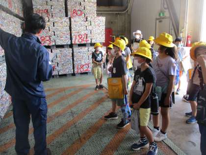 昼食を常願寺公園で食べてから、リサイクルセンターへ行きました。まず、ごみ処理についての話を聞き、その後、回収されて潰された空き缶や中央操作室でごみが処理される様子を監視しているところを見ることができました。ごみがどのように処理されているかについて知ることができ、ごみ学習への意欲をさらに高めることができました。