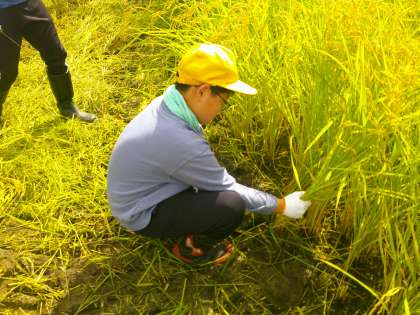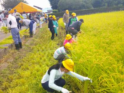 今日はファーム高善寺の皆さんの協力のもと、稲刈り体験を行いました。稲の根元の堅さに驚きながらも、どんどん稲を刈っていく子供たちでした。