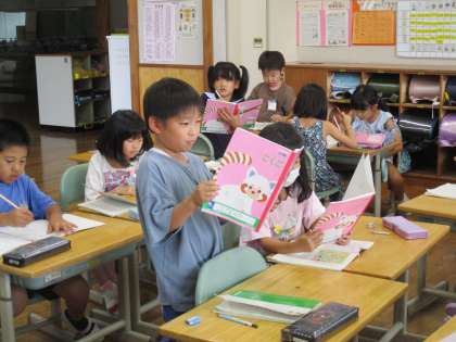 国語科の学習では、友達に道案内するための分かりやすい表現について考えています。子供たちは、「目印があると分かりやすいね」「いつ曲がるのかはっきりさせたいね」など、ポイントを捉えて案内文を作っていました。また、友達の案内を聞いて待ち合わせ場所までちゃんとたどり着けたか、友達に確かめに行く様子から、一生懸命学習していることが伝わってきました。