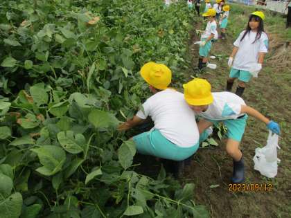 たくさんの枝豆を収穫することができました。力強く張った根っこごと茎を引き抜いたり、豆を摘んだりする活動を楽しむ子供たちでした。