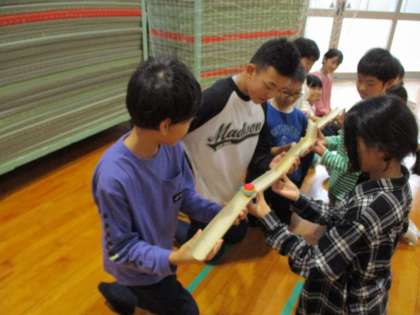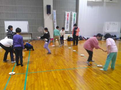 1日目は雨天のため、全て館内での活動となりました。最初に遊びリンピックを行いました。パイプライン、羽子板ラリー、どんぐり箸移し、割り箸ダーツの4種目を班対抗で競い合いました。どの競技も盛り上がり、子供たちの元気な声がたくさん聞こえました。