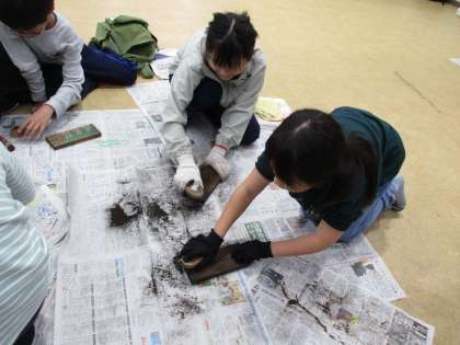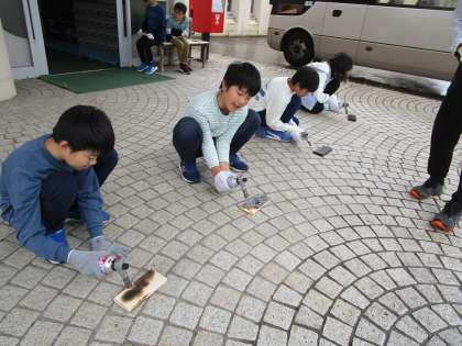 次に焼き板絵付けを行いました。ガスバーナーで板をしっかりと焼き、ブラシで板をこすり、すすを落とした後、絵を描きました。どこに飾るか考えながら、思い思いにデザインを考えていました。