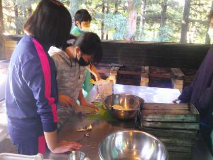 午前中には、野外炊事でピザ作り、午後には、大丸山登山を行いました。