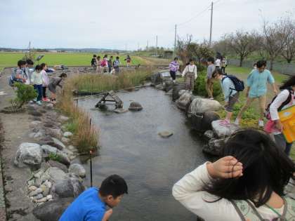 井田川沿岸のビオトープへ向かう道中では、幸運なことに飛んでいく白鳥を見ることができ、ここでも保内のすてきを感じることができました。