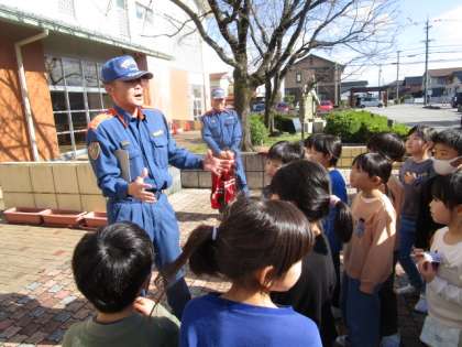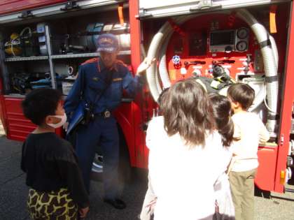 避難訓練のために学校に来ていた消防車を間近で見せてもらいました。子供たちは、今、国語科で「じどう車くらべ」を勉強しているので、車のつくりに興味津々でした。消防士の方にもインタビューをして意欲的な子供たちの姿が見られました。