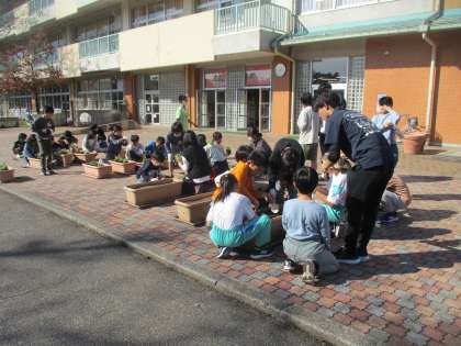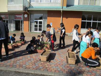 今日の午後の休み時間に、各クラスから希望者4名の子供たちが集まり、一緒にビオラの花苗をプランターに植えました。低学年の子供たちは、環境委員会の子供たちに植え方を教わりながら、一生懸命に植えていました。他の学年の子供たちも、自分に任された分の花苗を植えました。みんな協力しながら植えることができ、満足した表情が見られました。