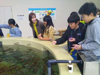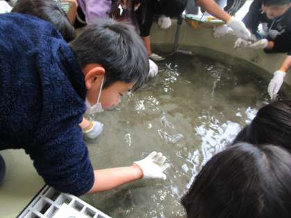 その後、体験コーナーでは魚に餌をあげたり、触ったりしました。見学・体験を通して栽培漁業について理解を深めた子供たちです。