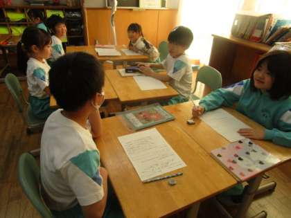 国語の時間にペアで「今一番楽しいこと」を聞き合っています。子供たちは「いつからやっているの?」「どこでやってる?」といった質問をしていて、友達の話を詳しく聞こうとする姿が見られました。