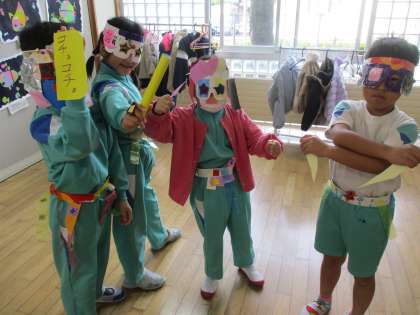 図画工作科の時間に作ったお面とベルトで変身しました。Chromebookを使って友達と記念写真を撮ったり、動画機能を活用してショートムービーを作ったりと自分なりの楽しみ方をしていました。