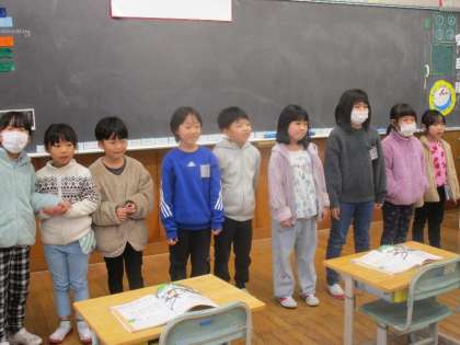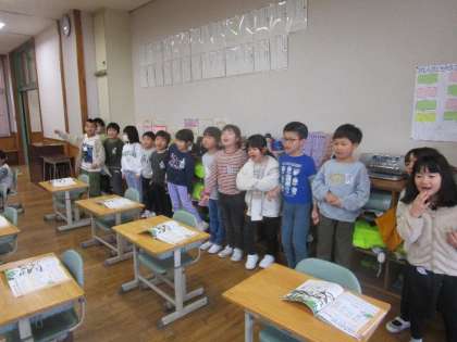 3学期が始まって4日が経ちました。一年生は寒さに負けず元気に学習や活動を行っています。今日の音楽では「アイアイ」を歌いました。2つのグループに分けて呼びかけを行い、楽しそうに歌う子供たちの姿を見ることができました。