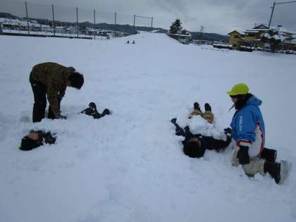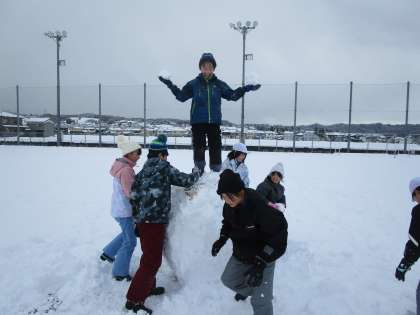 校庭に降り積もった雪で遊びました。そりで滑ったり、雪合戦をしたり、大きな雪玉をひたすら作ったり、子供たちは思い思いに楽しみました。