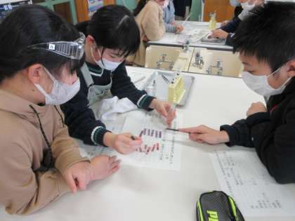 理科の学習では水溶液の性質を調べる実験をしました。友達と実験の仕方や結果を確かめながら協力して活動していました。