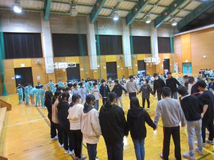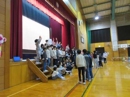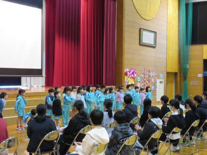 卒業を祝う会の様子です。1年生は6年生への歌とメダルのプレゼント。4年生は、6年生とのジェスチャーゲーム。3年生は、6年生との大縄とフラフープくぐり勝負の出し物を披露しました。