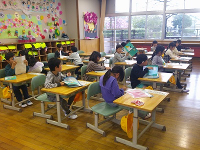 教室では、先生のお話を聞いて、プリントを連絡袋に入れることができました。
