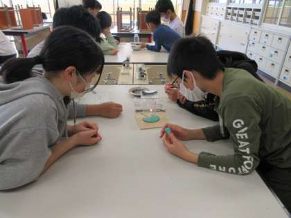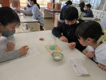 理科では、ろうそくに火を付けて、線香のけむりがどのような流れで集気瓶の中を通るのか実験しました。安全に気を付けながら、じっくりとけむりの流れやろうそくの火の様子を確認しました。