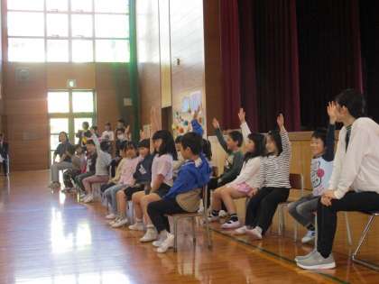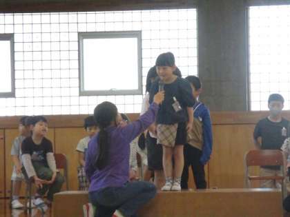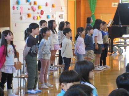 2〜6年生のお兄さん、お姉さんに入学おめでとう集会を開いてもらいました。どの学年も楽しい出し物を用意してくれて、1年生はとても喜んでいました。また、1年生は全校の前で自己紹介をしたり、入学してから練習を続けてきた校歌を発表したりしました。お兄さん、お姉さんから「校歌が上手!」と褒めてもらいました。