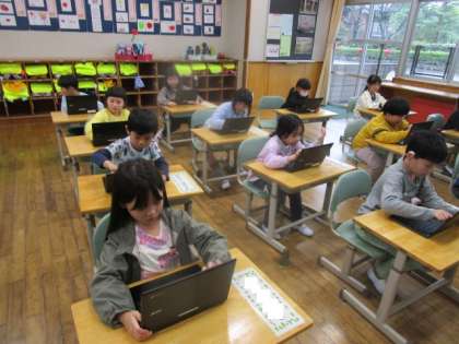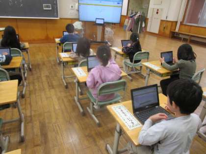 1年生は初めてクロムブックを使って学習しました。パスワードを自分で入れて、1年生のクラスルームを開いたり、ジャムボードで字や絵をかいたりしました。約束を守り、楽しく活動することができました。