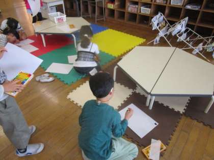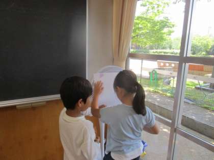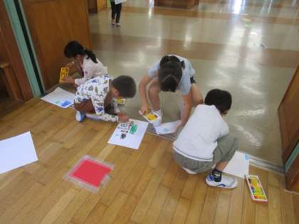 図画工作では、教室や周辺の教室、廊下等のいろいろなものに紙を当て、かたちやもようをうつしとりました。目で見ると平らに見える場所でも、紙を当ててうつしとると、でこぼこが浮かび上がってくることもあり、驚いていました。