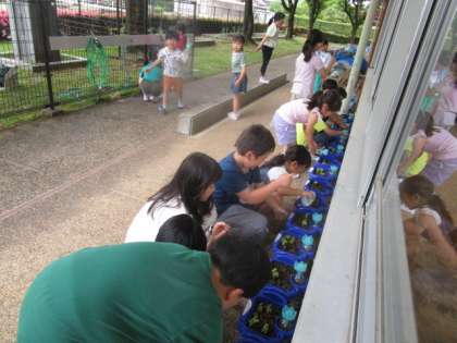先週たねまきをしたあさがおの芽が続々と出始めています。子供たちは毎朝あさがおの様子を見るのを楽しみにしています。そして、水をやったり、「大きくなあれ」と魔法をかけたりしながら大切に育てています。