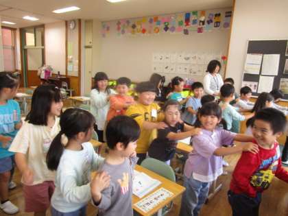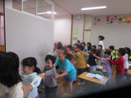 しろくまのジェンカでは、さらに、友達とつながってリズムに合わせてステップをしました。友達と息を合わせて、笑顔いっぱいに活動していました。