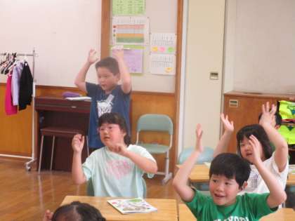 1時間目の音楽では、「かたつむり」になりきりながら楽しく歌いました。