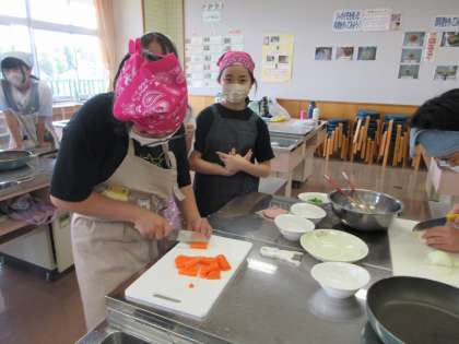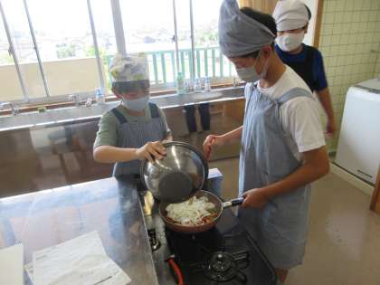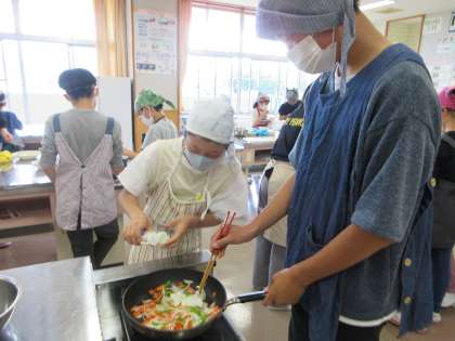 家庭科の調理実習で野菜炒めを作りました。野菜の固さで炒める順番を考えたり、火が通りやすくなるように切り方を工夫したりしました。美味しくできたグループもあれば、炒める時間が短かくて野菜が固かったグループもありました。今回の経験を今後の生活に生かしてほしいです。