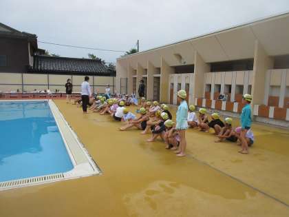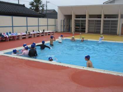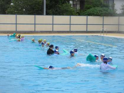 2、3年生合同で水泳学習を行いました。小プールでは、壁つたい歩き、大プールでは水中かけっこ等をしてから、自分の目当てに向かって水泳練習に励みました。