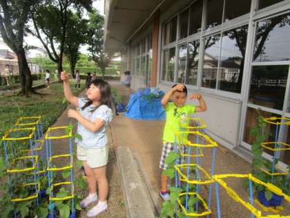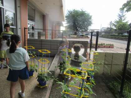 毎日心をこめてお世話を続けています。つるがぐんぐん伸びて、自分たちの背や先生たちの背を越えてきています。また、つぼみがたくさんできて、そろそろ花が咲きそうです。